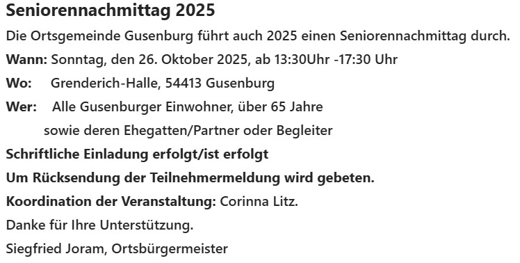 Die Versteigerung von Laubbrennholz für den Ortsbedarf in Gusenburg findet am Samstag, den 08. November 2025, um 14.00 Uhr im Feuerwehr- und Gemeindehaus in Gusenburg statt.