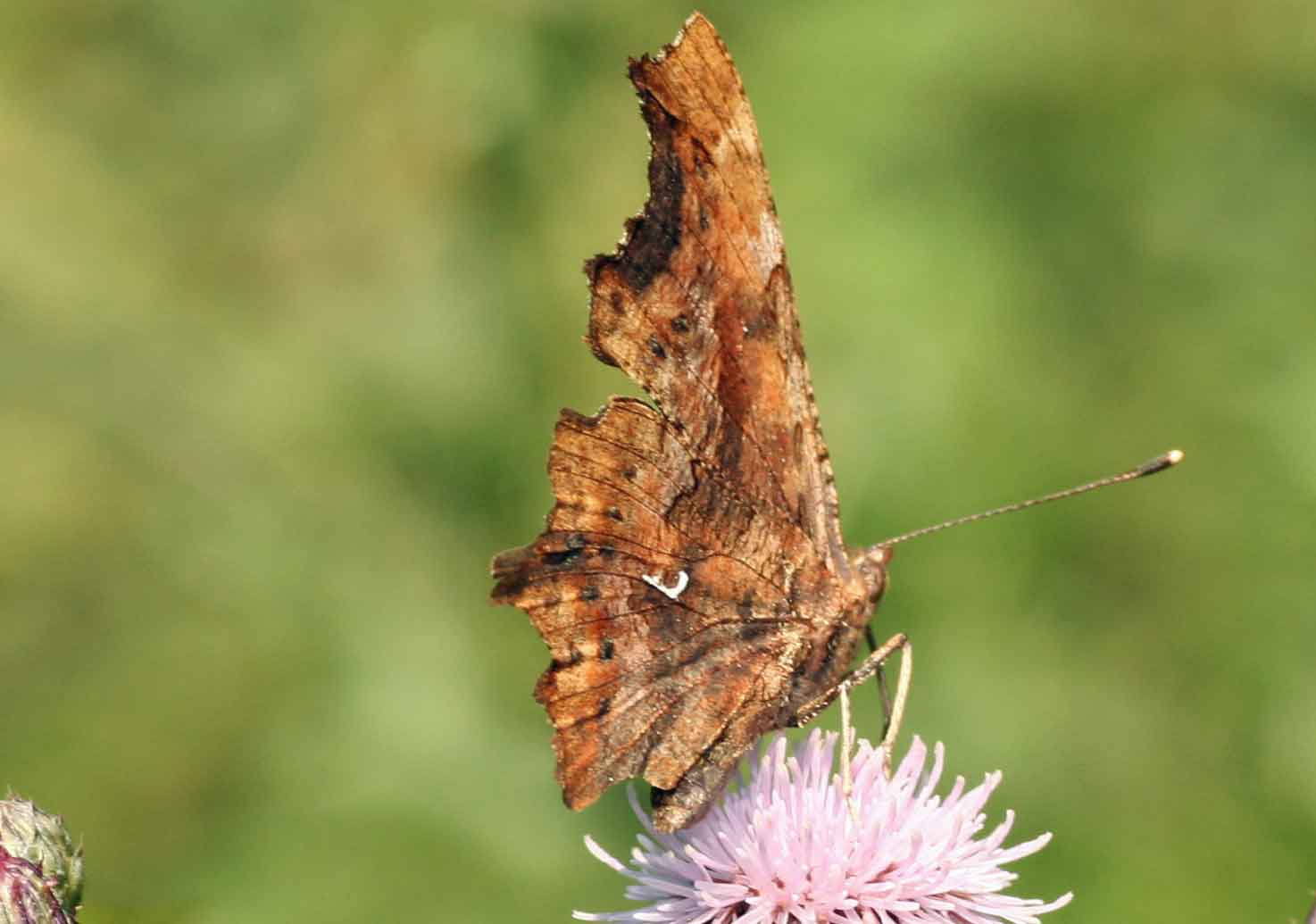 Der C-Falter oder Eckenfalter ist bei uns regelmäßig anzutreffen. Er fliegt meist in einer Generation hauptsächlich im Sommer. Den Namen hat der C-Falter von dem weißen C auf der Unterseite seiner Flügel.